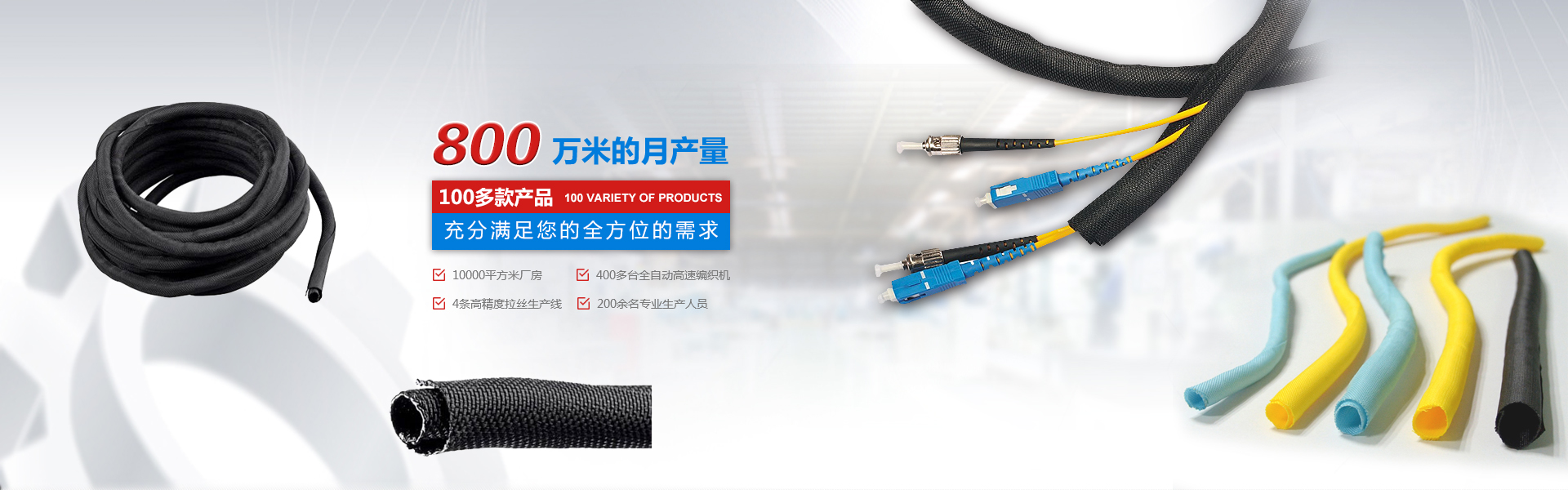 自主設(shè)計、研發(fā)、規(guī)模化大型生產(chǎn)企業(yè) 擁有廠房10000平米,400多臺全自動。高速編織機(jī)四條高精度紡絲生產(chǎn)線,員工200余人,月產(chǎn)量800萬米,中國最大絕緣保護(hù)套管生產(chǎn)企業(yè)之一。